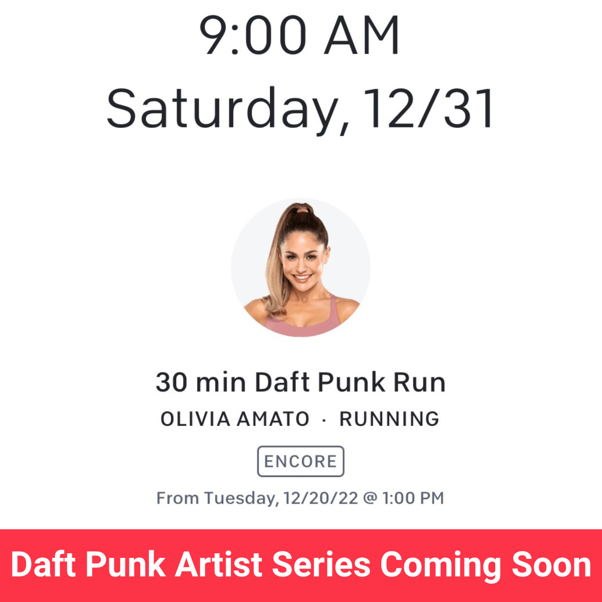 As of publishing time, an encore 30-minute Peloton Daft Punk Run is currently on the upcoming schedule for 10:00 a.m. ET on Saturday, December 31 (New Year’s Eve) with Olivia Amato. Update – Shortly after we shared this, the class was removed from the schedule.