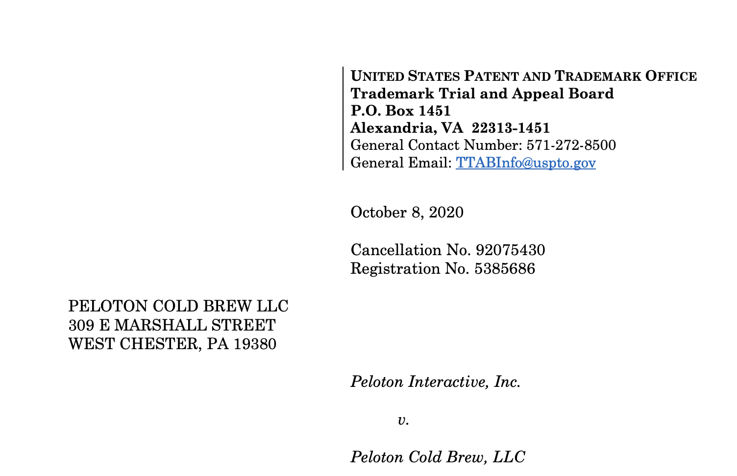 Peloton has filed a petition with the United States Patent and Trademark Office requesting that they invalidate, or cancel, trademark #5385686 previously granted to Peloton Cold Brew, LLC.