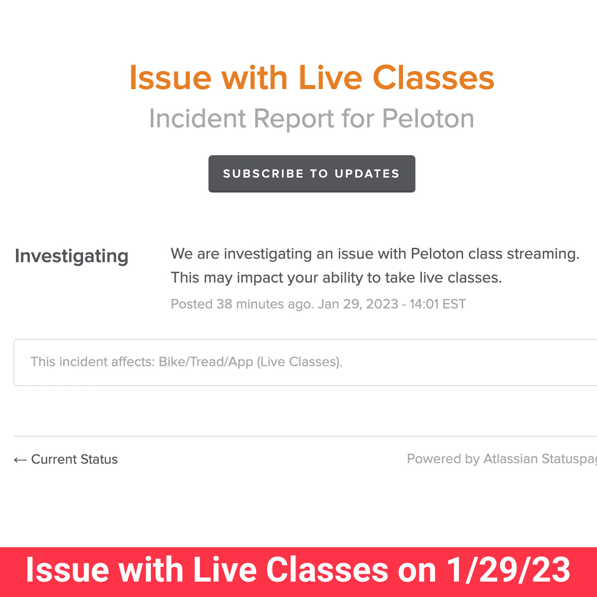 The outage does not appear to be impacting on-demand classes – only live Peloton classes. There is only one remaining live class today, so we would expect the issue to be resolved before any live classes are scheduled to begin on Monday, January 30th.