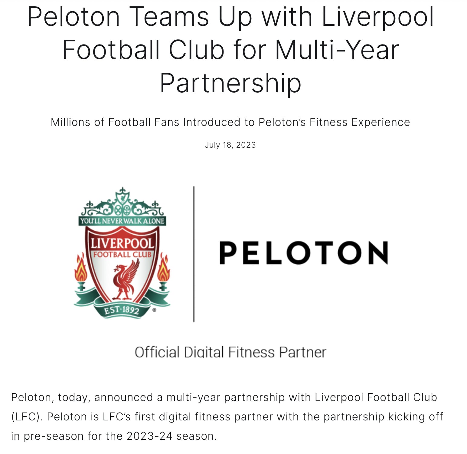 Peloton press release announcing partnership with Liverpool Football Club.