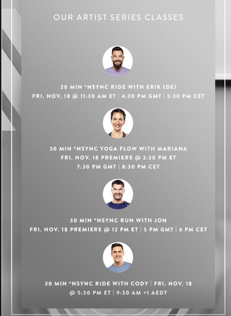 This ain’t no lie, the @nsync Artist Series is coming to a screen near you. Dust off your old dance routines and join @robinnyc, @alexpeloton, @marcel2coach, @hauptstadttrainer, @la_tiamariana, @jon_hosking, and @codyrigsby on Fri., Nov. 18, for their iconic *NSYNC Artist Series Classes.
