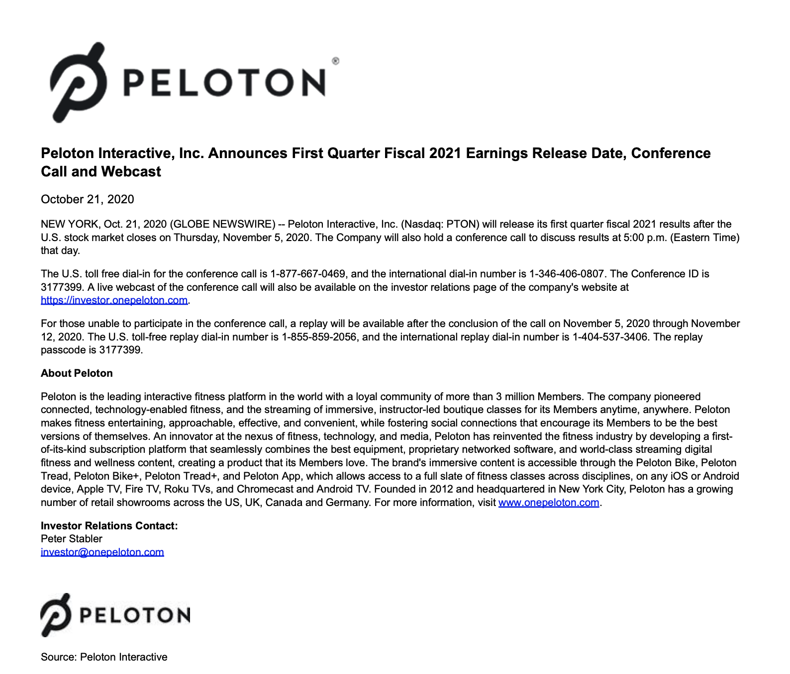 Peloton has announced that their Q1 2021 earnings results will be released on Thursday, November 5th, 2020. Peloton will also hold a call to discuss the results @ 5:00pm ET on November 5th.