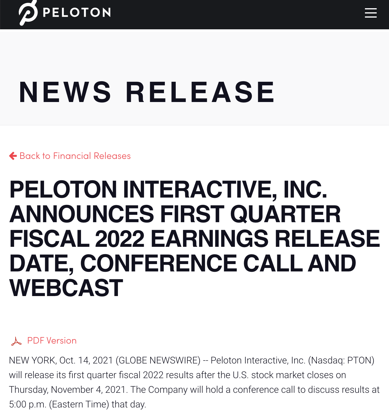 Peloton has announced that their Q1 2022 earnings results will be released on Thursday, November 4th, 2021. Peloton will also hold a call to discuss the results @ 5:00pm ET on November 4th.