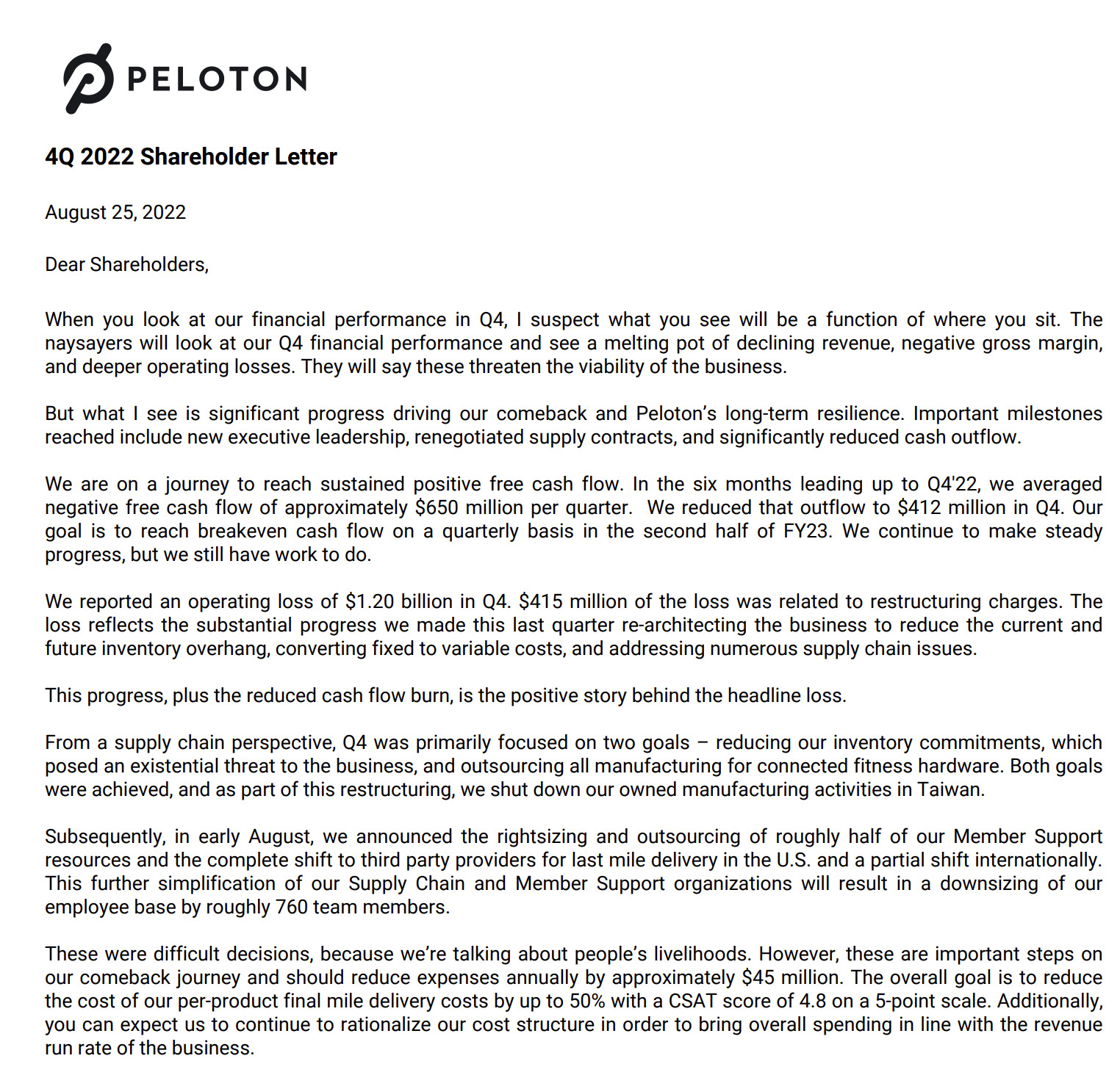 McCarthy’s overall goal for Peloton is to “reach breakeven cashflow on a quarterly basis in the second half of FY23”, and says that as FY 2023 unfolds he will have more to say about Peloton’s operating plans.
