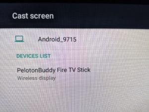 You’ll then see a screen similar to the above. The first name shown, Android_XXXX, is simply the internal name of your bike. You can ignore this (unless you have multiple bikes). The main part to look at is the Devices list. This will show the list of devices that have Miracast enabled and are on your same network. Assuming you followed the above directions, you should see the name of your Fire TV 4K stick listed. If it is in mirroring mode, it will be in black text and you will be able to click it. If it’s not in mirroring mode, it will either not be listed (if you’ve never clicked it before), or be listed but be gray (meaning it’s not accepting mirroring connections). Click on the name of your Fire TV stick on the Peloton display, and it will begin connecting. After a few seconds (usually 5-15), your Peloton screen should pop up on the TV. Hit the Peloton icon in the bottom center of the screen to go back to the home page and you’re ready to get to your workout!