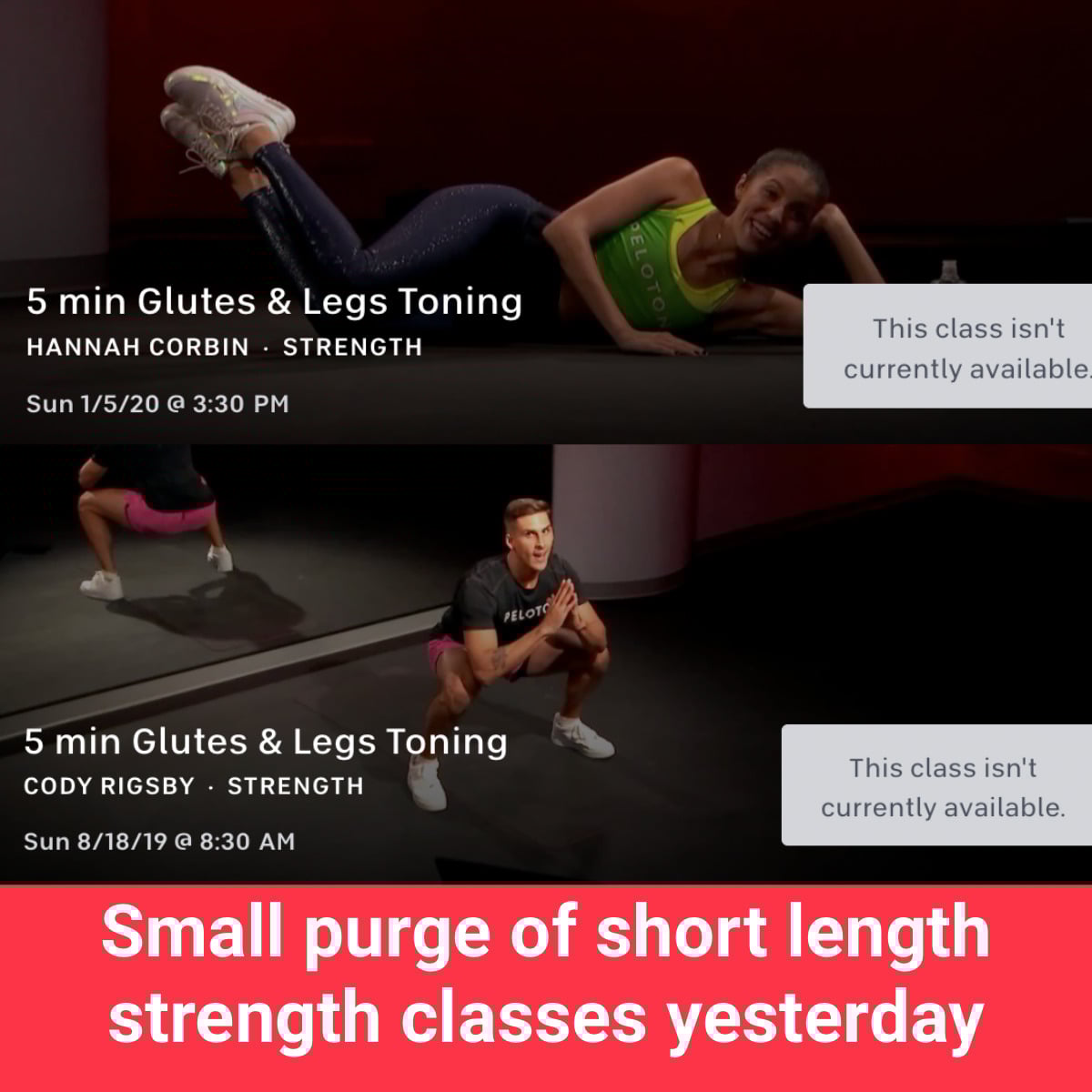 In particular, it appears that all of the five minute Glutes & Legs Toning classes have been removed from the on demand library. Instructors Hannah Marie Corbin, Cody Rigsby, and Ally Love had a number of these classes available from 2019 and early 2020. Peloton has not made any new Glutes & Legs Toning content since launching their Barre and Pilates modalities.