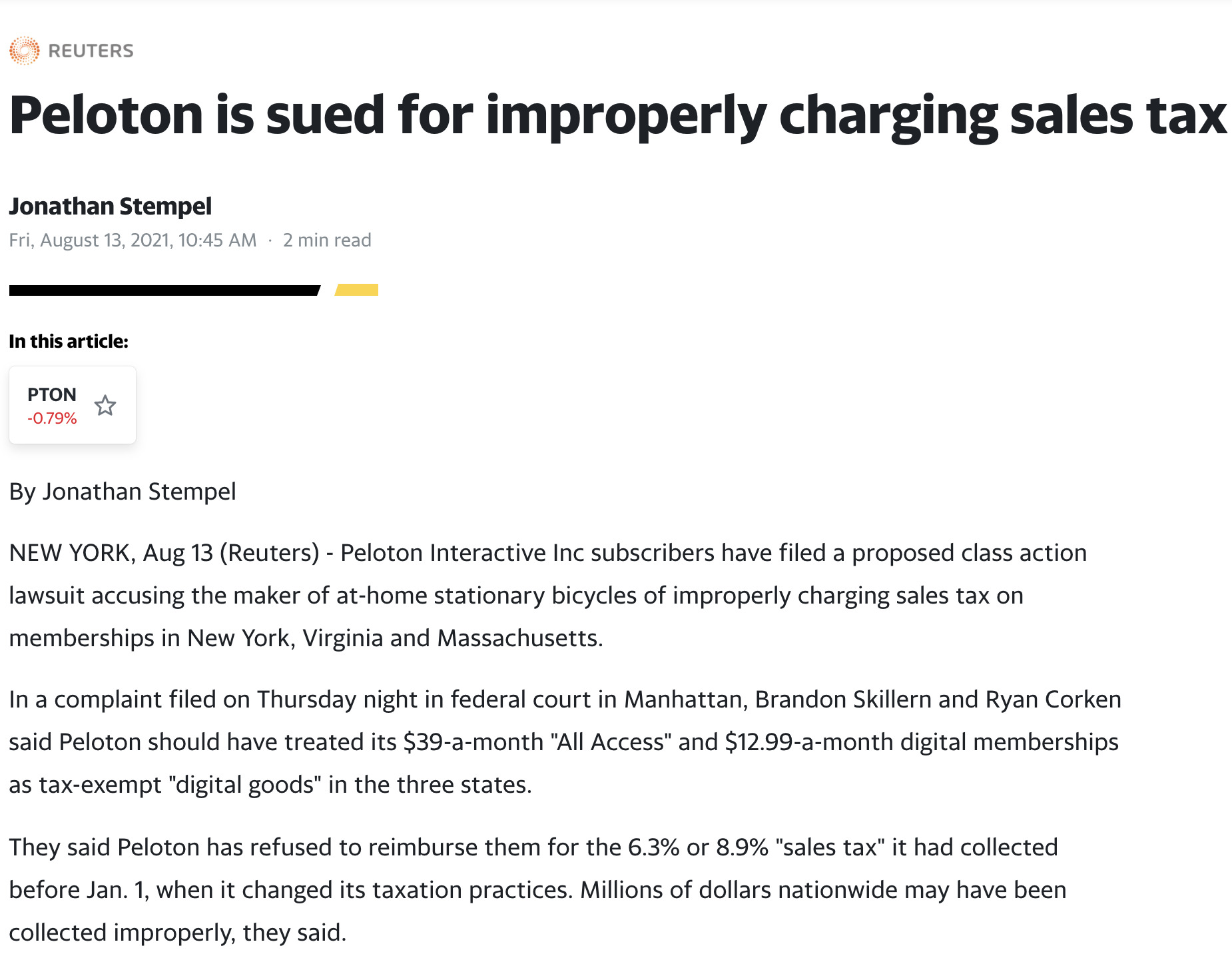 Peloton has been hit with yet another lawsuit. Reuters reports that a class action lawsuit has been filed regarding how Peloton charges sales tax in the states of New York, Virginia and Massachusetts.