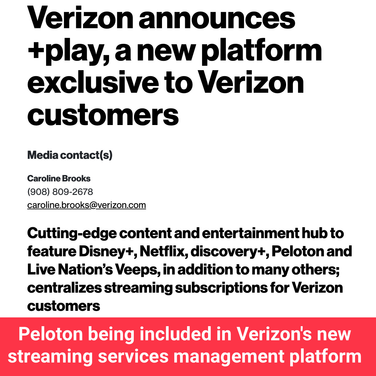 Peloton will be included in Verizon’s new platform – +play – which allows Verizon customers to view and manage all of their streaming subscriptions from one location. Verizon made the announcement at their most recent investor event: