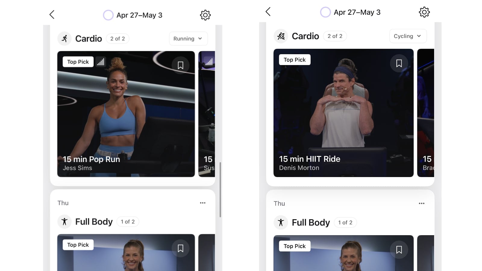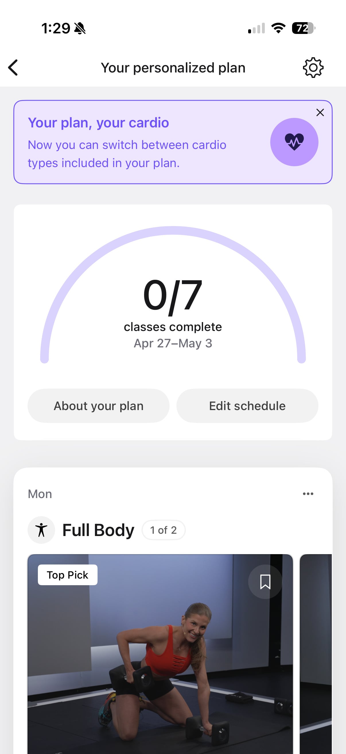 If your plan has scheduled you for a running class on a particular day, you can now swap that day’s cardio recommendations to cycling or rowing instead, without changing the rest of your plan, or vice versa.