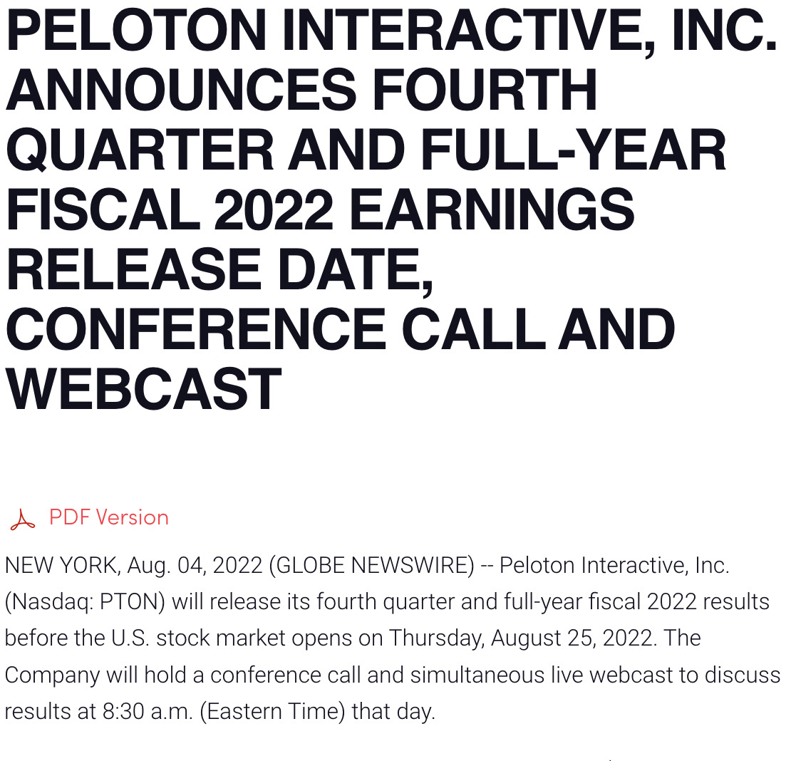 Peloton Full Year & Q4 2022 Earnings Call Date Announced for August 25th 2022