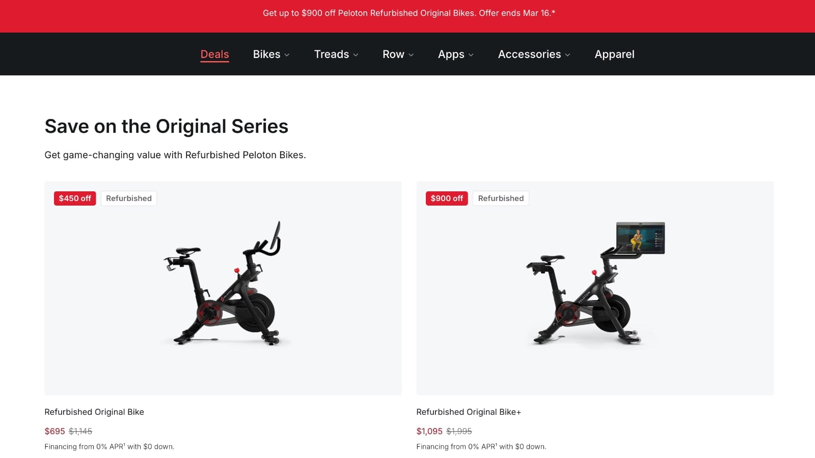 Peloton is running a sale on their Certified Refurbished Original Series Bike & Bike+, with up to $900 off through March 16, 2026. The sale includes discounts on both the refurbished Peloton Bike and refurbished Peloton Bike+.