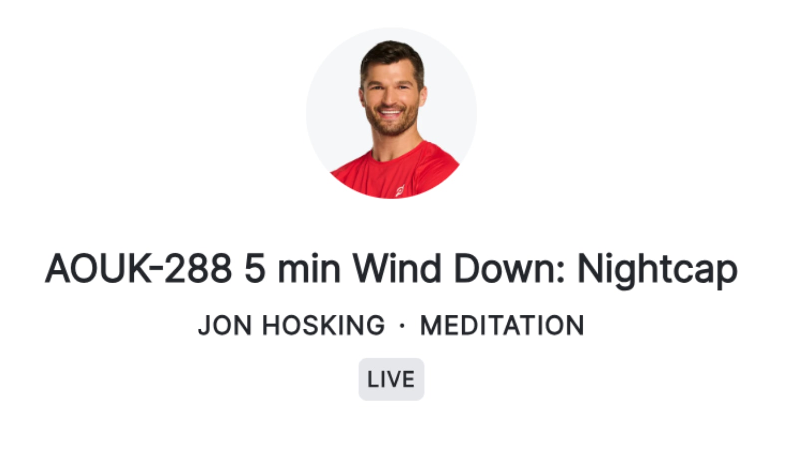 A class titled “AOUK-288 5 min Wind Down: Nightcap” – classified under the meditation modality and taught by Jon Hosking – was posted on the upcoming Peloton schedule for a short time before being removed. This was originally scheduled to take place on Tuesday, October 15th @ 10:20am ET. This slot seems to have been a class intended for a future on-demand release, which was accidentally posted to the public live schedule instead.