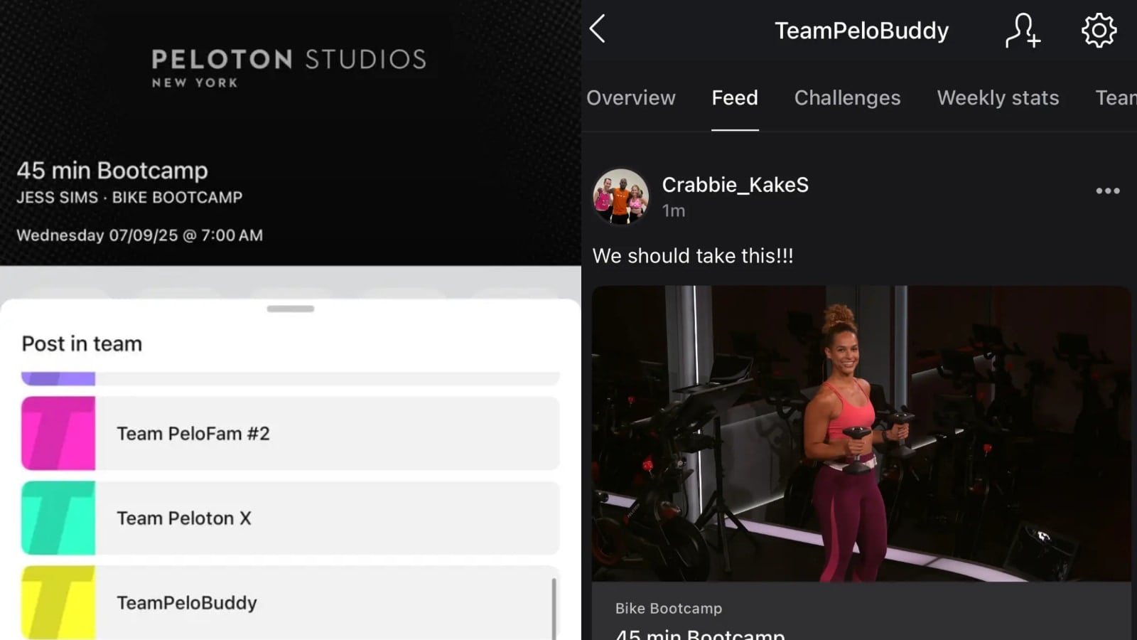 5. Tap to send, and the class will appear in the Feed of your Team within the Peloton Teams section of the app.