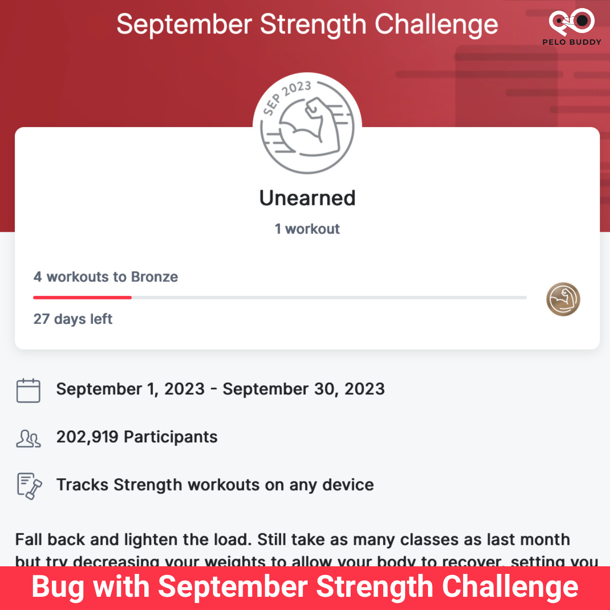 However, since September 1st many members have reported that the challenge is tracking every workout they complete with Peloton – such as rides, runs, meditations, etc. – as a strength workout. This has caused members to earn badges for the challenge even though they have not technically fulfilled the requirements.