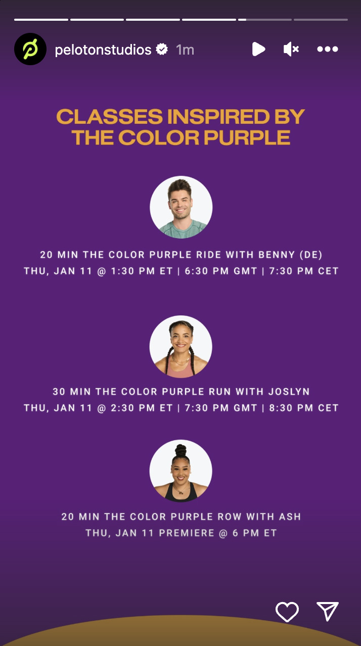 The Color Purple Peloton classes will begin on Thursday, January 11, and will include five classes across four modalities, including one class in German. All of the classes in the series will take place live.