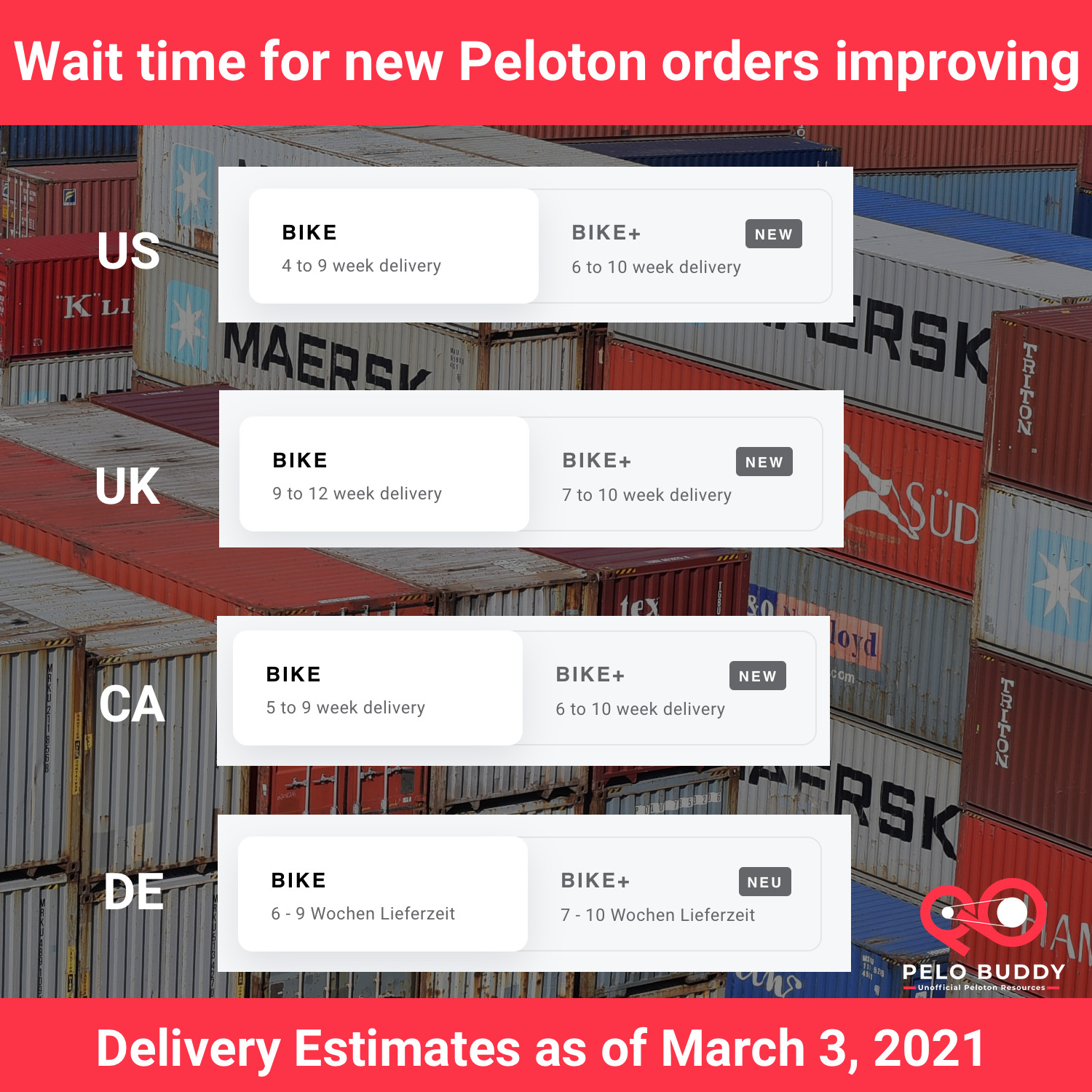 We will continue to track & report on the estimated times in the coming weeks & months. Peloton has stated they hope to have delivery windows in the 2-4 week time period by the end of the spring, and ideally would like to see it return to under 2 weeks.