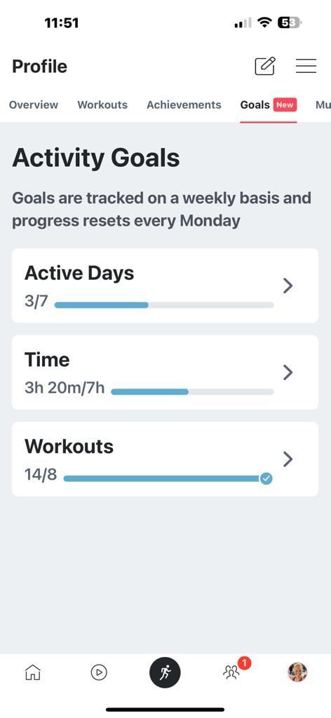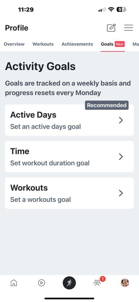 You don’t have to limit yourself to one goal either – you are able to have a goal of each type you are working towards. In other words, you can have an active days goal, time goal, and workouts goal all for the same week going on at the same time.