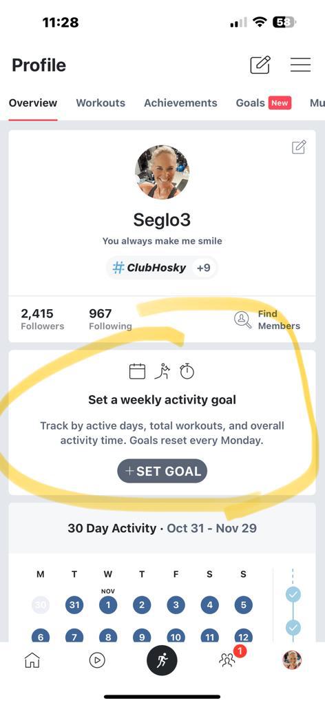 If you have the new feature, you’ll see a new “Goals” menu item at the top of your Profile page (similar to where you find the Music feature Peloton recently added). There is also a new widget for the feature underneath how many followers you have.